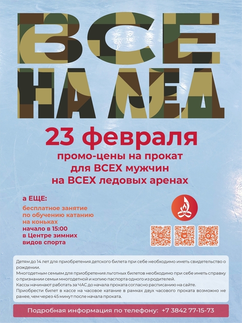 ⭐23 февраля для ВСЕХ мужчин на ВСЕХ ледовых аренах действуют промо-цены на катания: часовой сеанс - 220 ₽, двухчасовой сеанс 330₽ (цена фиксированная с учетом проката коньков). Следите за обновлением расписания катаний на нашем сайте.